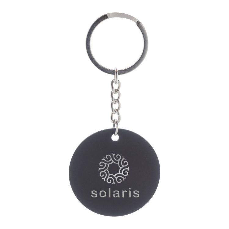 Porte-clés en acier inoxydable recyclé en forme ronde avec finition caoutchoutée. Revêtement spécial pour gravure laser miroir, de couleur noir