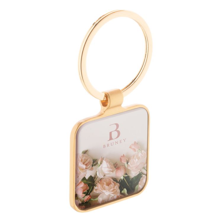 Porte-clés en métal de forme carrée finition dorée avec plaque en bronze à canon. Livré dans une boîte en papier kraft.