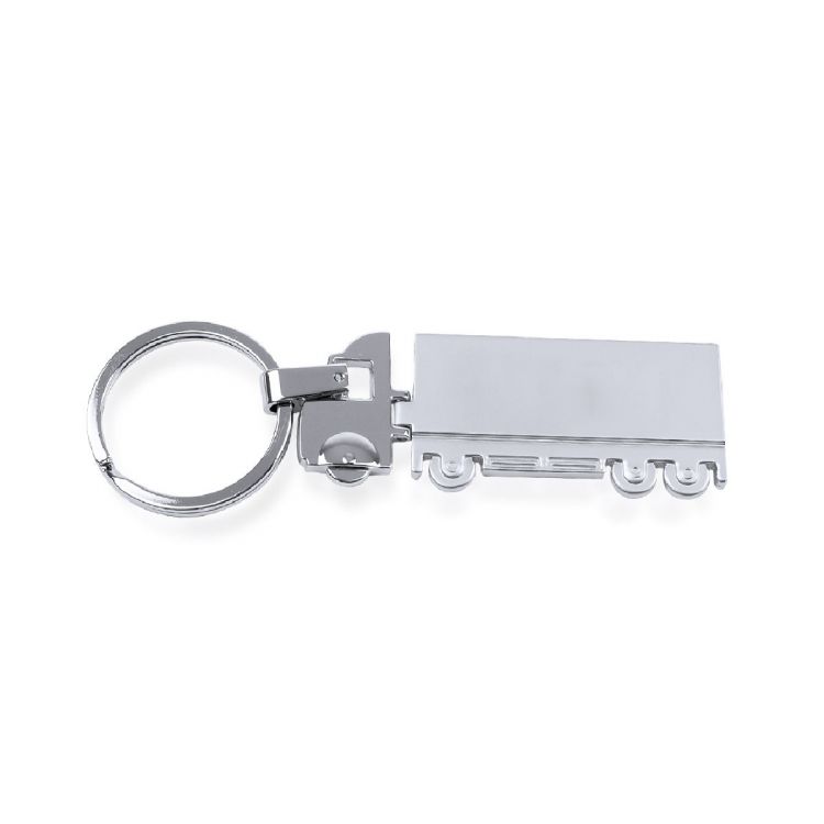 Porte-clés métallique en forme de camion, idéal pour le marquage laser. Cabine du camion en finition brillante et remorque en finition mate. (couleur naturel)