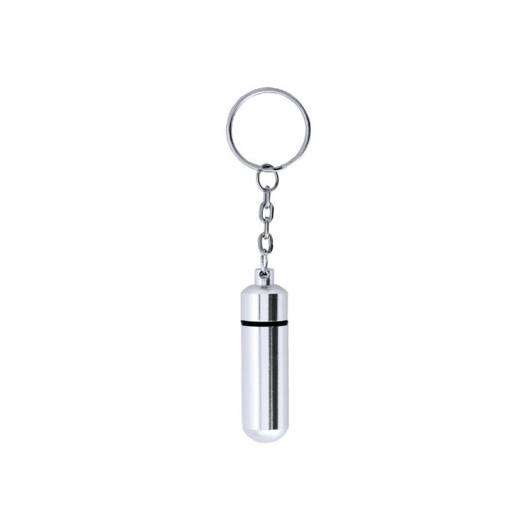 Porte-Clés pilulier de forme discrète avec corps en aluminium brillant. Fermeture à vis. (couleur naturel)