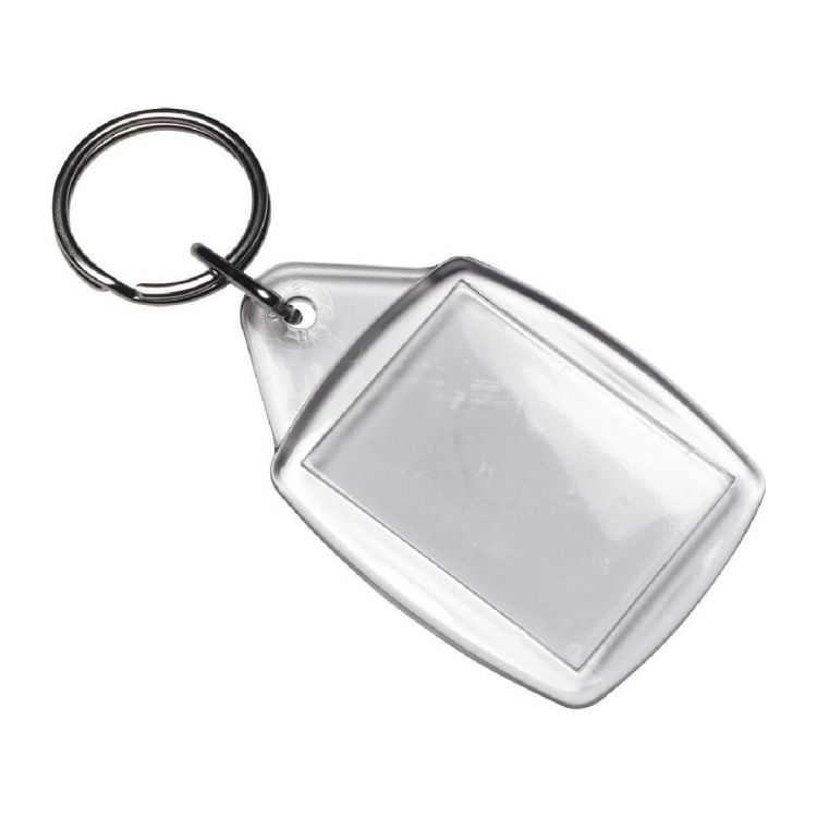 Porte-clés en plastique translucide. Le marquage est réalisé sur un insert papier.