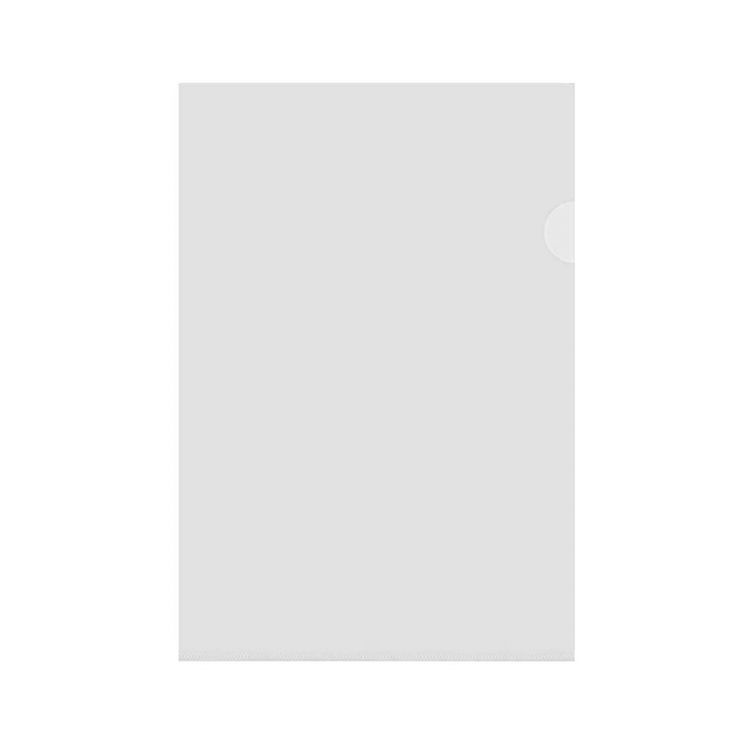 Chemise à dossier en forme de L en satin semi-transparent, avec ouverture sur un côté pour faciliter l'insertion des documents.
