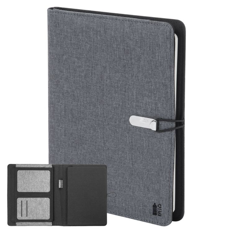 Porte-documents A5 en polyester 300D RPET avec bloc-notes de 64 feuilles lignées et plusieurs poches d'organisation à l'intérieur.