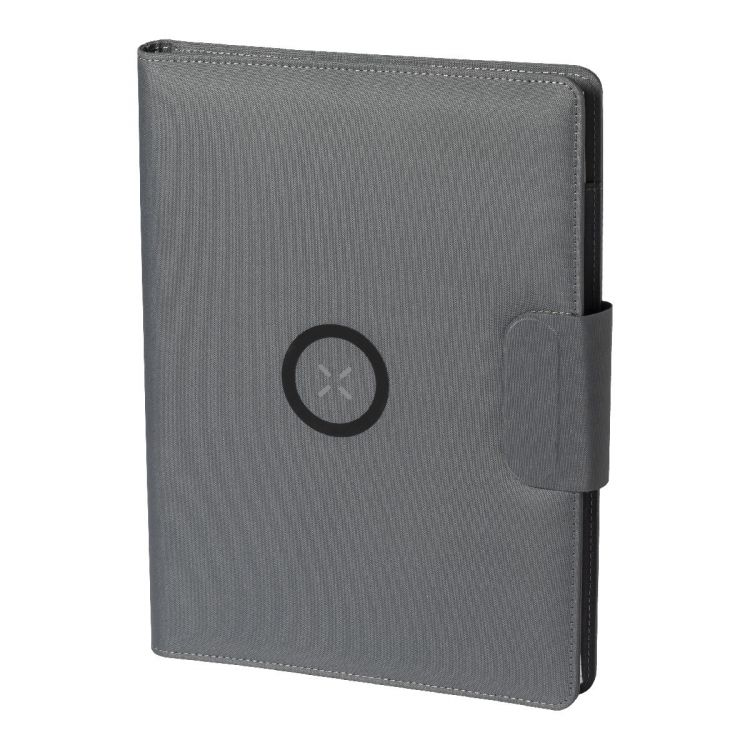 Porte-documents A4 en polyester 300D RPET avec chargeur rapide magnétique sans fil intégré (10W), powerbank 5000 mAh avec port de charge USB, support pliable pour téléphone portable et bloc-notes de 20 feuilles lignées. Comprend un anneau métallique autocollant pour utiliser la fonction magnétique sur n'importe quel appareil à chargement sans fil. Câble de chargement USB inclu, de couleur gris