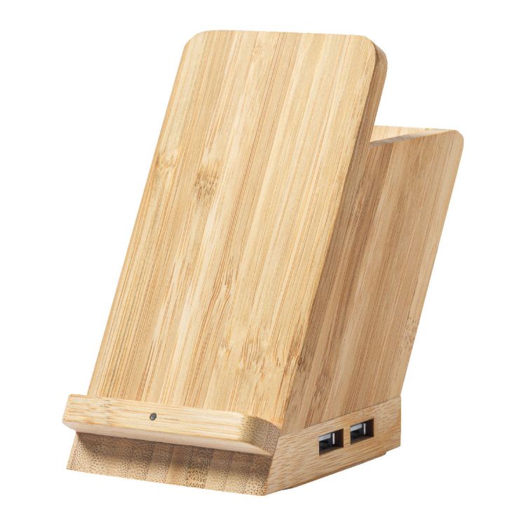 Porte-stylo multifonctionnel en bambou avec support pour téléphone portable, chargeur sans fil (5W) et hub USB à 4 ports (USB 2.0). Livré avec câble USB