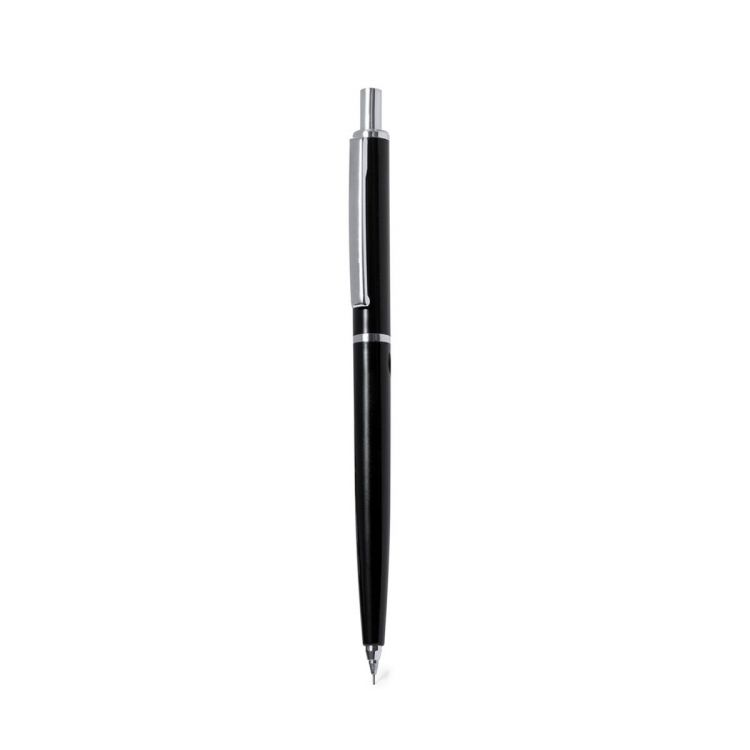 Porte-mines élégant en ABS robuste. Corps en noir et poignée assortie au toucher lisse, avec des éléments chromés comme bouton, clip, pointe et anneau central.Avec caoutchouc et mines incluses de 0,7 mm. (couleur noir)