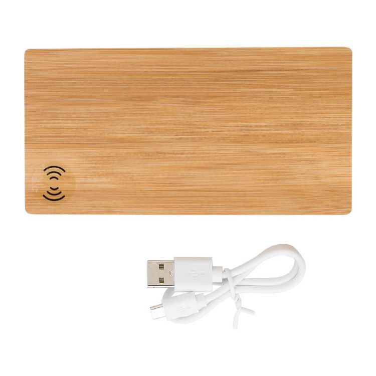 Power bank sans fil en bambou équipée d'une batterie Li-polymère d'une capacité de 6 000 mAh, une entrée de DC5V/2A et une sortie DC5V/1A, inclus un câble de charge (prise USB C).