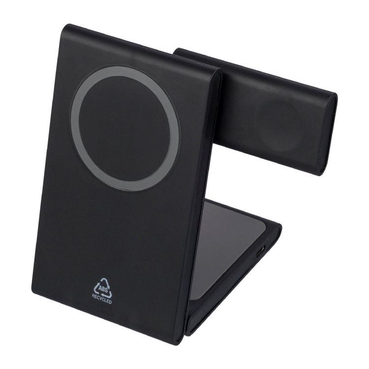Station de charge magnétique sans fil 3-en-1 en ABS recyclé pour smartphone, montre connectée et écouteurs. Design ultra-plat avec support pliable. Sorties de charge : téléphone 15 W, AirPods 5 W, iWatch 2 W. Entrée : 5 V/3 A ??ou 9 V/3 A, sortie : jusqu’à 9 V/1,67 A. Logo recyclé. Emballé individuellement dans une boîte cadeau en kraft.