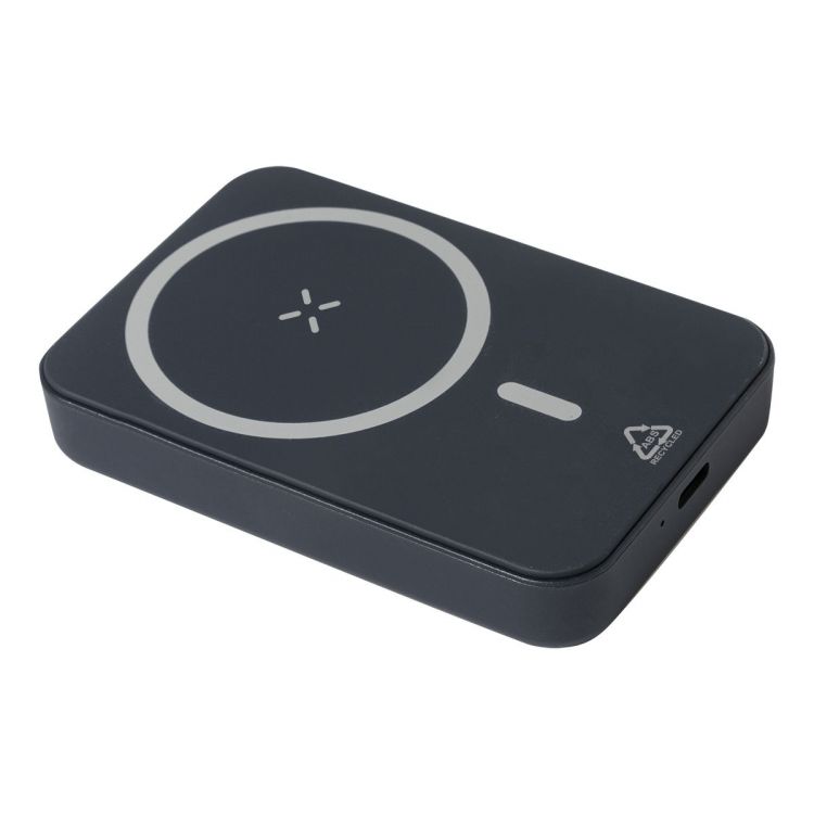 Power bank en ABS recyclé avec batterie de 5000 mAh et chargeur sans fil magnétique intégré (5 W). Avec entrée USB-C et port de chargement. Anneau métallique autocollant inclus pour utiliser la fonction magnétique sur tout appareil rechargeable sans fil. Compatible avec iPhone® 12 ou plus récent. Câble chargeurment USB inclus.