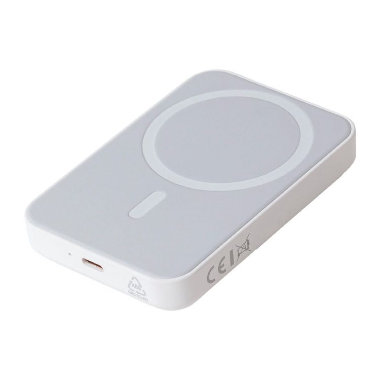 Power bank sans fil en ABS recyclé avec batterie Li-ion de 5 000 mAh et sortie de charge magnétique sans fil de 15 W (compatible MagSafe). Entrée Type-C jusqu'à 20 W et sortie Type-C : 5 V CC/3 A, 9 V CC/2,22 A, 12 V CC/1,67 A. Protection contre la surchauffe, les courts-circuits, les surtensions et les surintensités. Arrêt automatique en cas de surchauffe. Anneau métallique adhésif supplémentaire inclus pour la charge sans fil des appareils non MagSafe. Étiquette latérale avec logo ABS recyclé (RABS). Emballée individuellement dans une boîte cadeau en kraft et papier de soie.