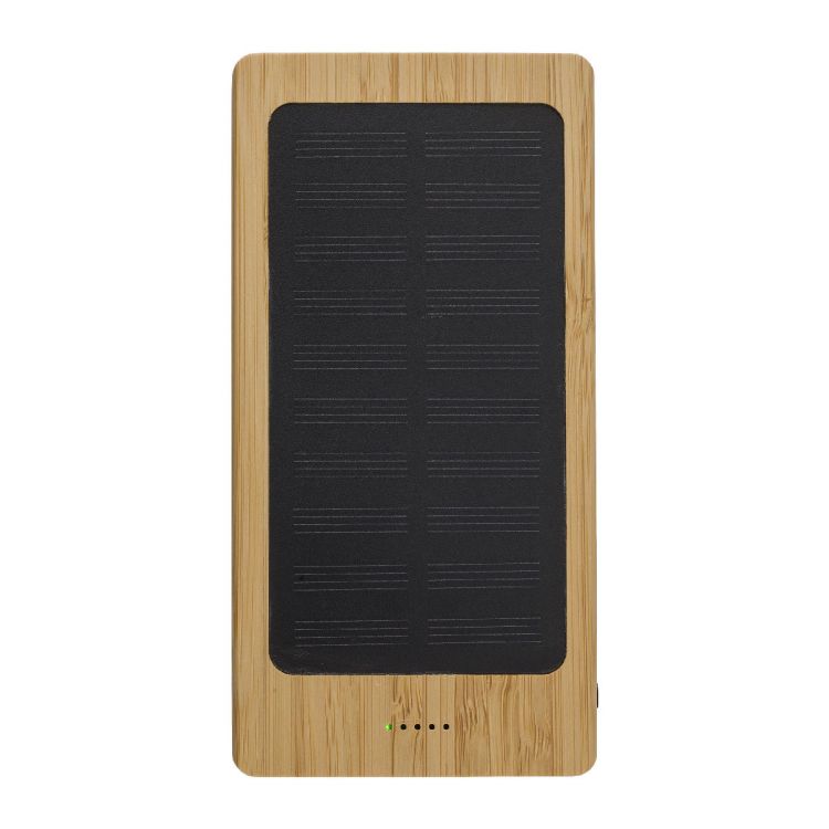 Power bank solaire en bambou équipée d'une batterie Li-polymère d'une capacité de 8 000 mAh, une entrée DC5V/2A et 2 sorties 5V/2, avec témoin de charge et câble de charge.