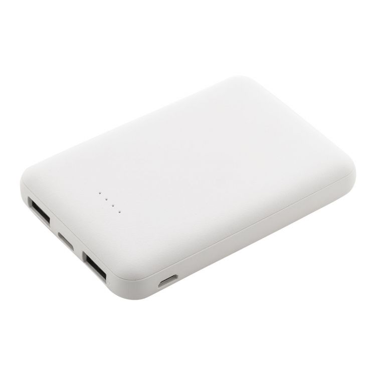 Power bank en ABS recyclé avec une batterie de 5000 mAh. Avec 2 ports de charge USB et 1 port USB-C. Ports d'entrée Micro USB et USB-C. Câble de chargement USB inclus.