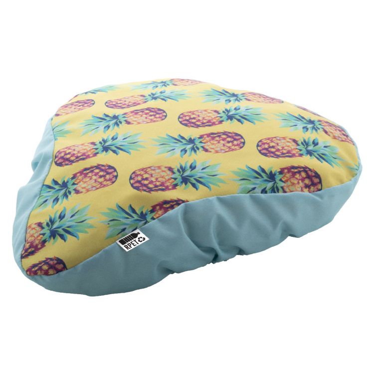Protège-selle de vélo imperméable, imprimée en quadri avec bande élastique RPET en 190T Polyester. Labélisé RPET. Le prix inclut l´impression en sublimation. Quantité minimale : 50 pcs