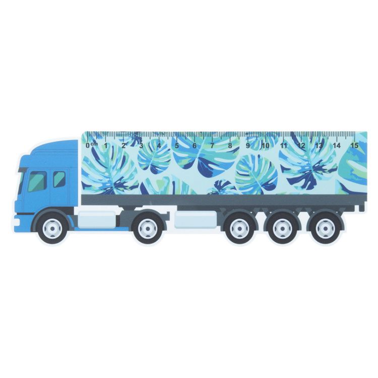 Règle flexible en plastique 15 cm personnalisable en quadri en forme de camion. Le prix inclut le marquage en UV LED sur un côté. Quantité minimale: 100 pcs
