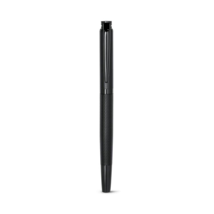 Roller en métal avec relief discret sur le corps. Fourni dans un écrin matelassé. Encre noire. Produit en couleur noir