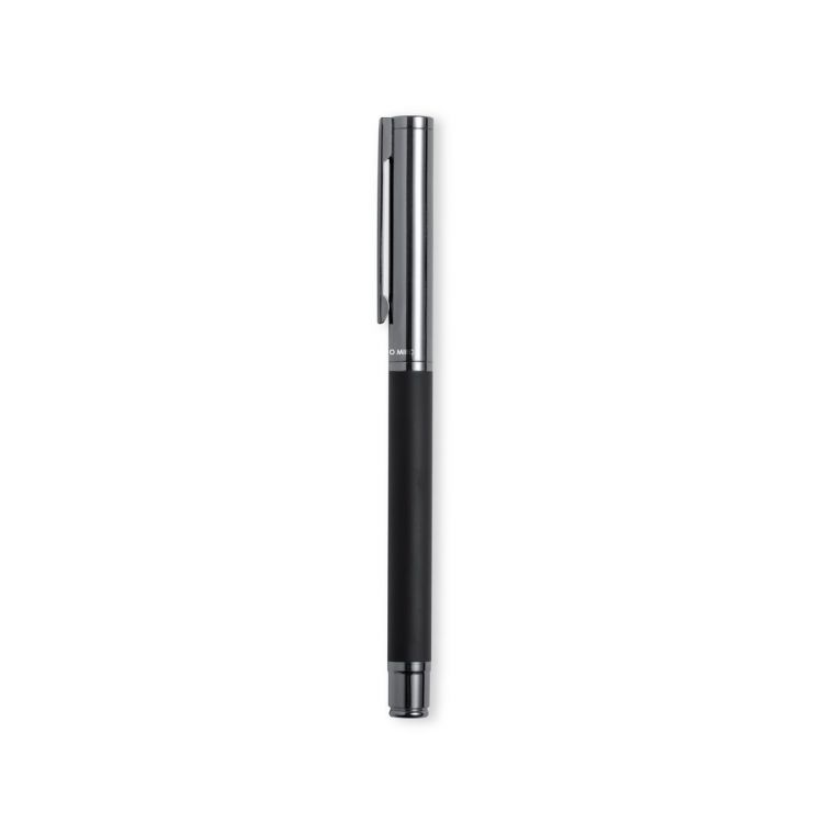Stylo roller d'Antonio Miró en métal, avec un corps noir mat. Détails et capot en chrome avec le logo de la marque. Cartouche Jumbo et encre bleue. Présenté dans une boîte noire individuelle élégante et résistante avec le logo Antonio Miró et une couverture assortie. (couleur noir)