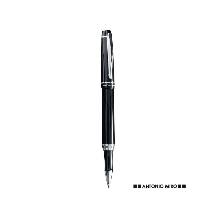 Roller à capuchon Antonio Miró au design bicolore élégant et au corps métallique doux et sobre en noir. Logo de la marque au dessous de la bague, clip et pointe en finition argent brillant. Présenté dans un étui noir avec le logo de la marque. Encre bleue. (couleur noir)