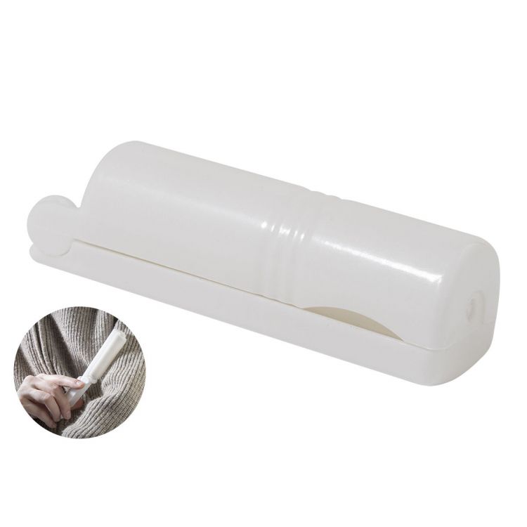 Rouleau anti-peluches compact dans un étui pliable en PP recyclé. Rouleau en TPR lavable et réutilisable, de couleur blanche