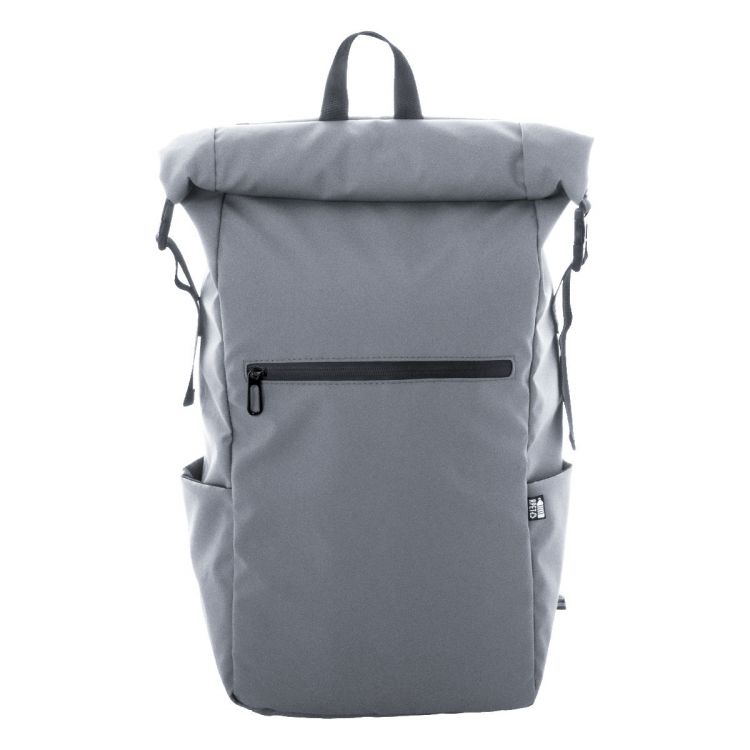 Sac à dos roll-top imperméable en RPET avec boucle et fermeture velcro, compartiment rembourré pour ordinateur portable (16") et tablette (10"), poche frontale zippée, poches latérales, dos et bandoulières rembourrés. Polyester RPET 600D enduit PU et labélisé RPET.
