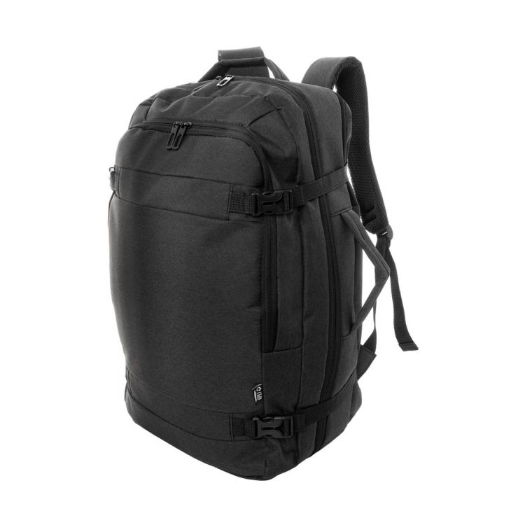 Sac à dos RPET double fonction, porte-documents avec 2 compartiments zippés, poche avant zippée et compartiment rembourré pour ordinateur portable (15"). Avec poche antivol, sangle pour trolley, dos et bretelles rembourrés. Polyester RPET 600D, labélisé RPET.