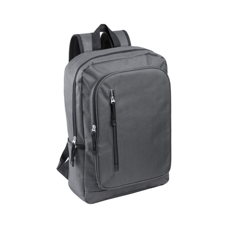 Sac à dos RPET avec compartiment principal zippé, 2 poches avant zippées, poches latérales et compartiment rembourré pour ordinateur portable (15"). Avec dos et bretelles rembourrés. Polyester RPET 600D, labélisé RPET.