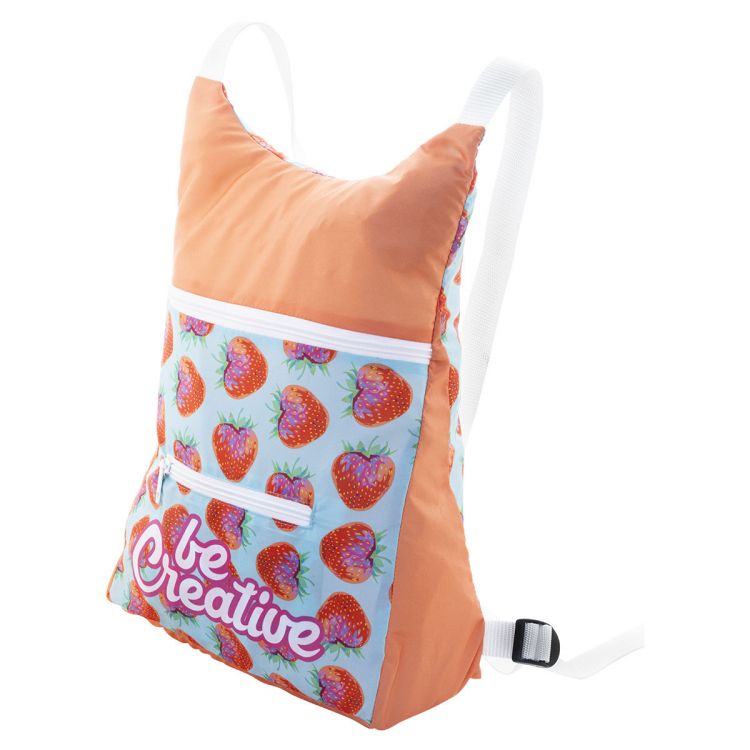 Sac à dos pliable en RPET avec compartiment principal zippé et poche avant zippée. Impression en sublimation sur toute la surface. Polyester RPET 190T et labélisé RPET. Quantité minimale : 25 pièces.
