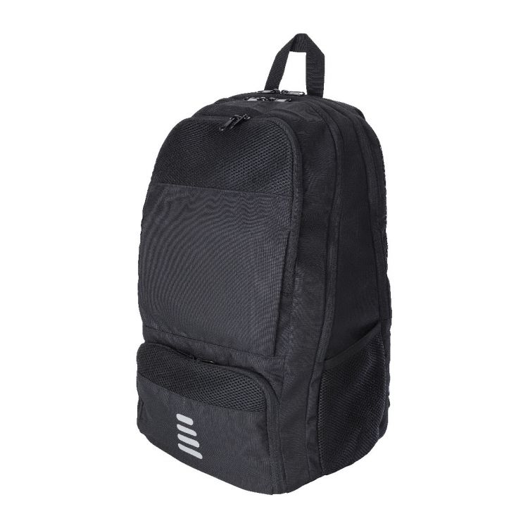 Sac à dos déperlant multifonctions en polyester rPET 600D comprenant une poche pour raquette, une poche anti-vol, un compartiment à chaussure, un compartiment pour ordinateur de 15'' et un compartiment pour une bouteille.