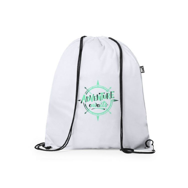 Sac à cordes en polyester RPET doux. Avec des cordes auto-fermantes, des coins renforcés et des bagues métalliques résistantes. Badge RPET sur étiquette latérale et disponible dans une gamme de couleurs variée (couleur blanche spécialement fabriquée pour l'impression en sublimation).Fabriqué à partir de plastique recyclé, ce qui encourage la réutilisation des déchets plastiques et contribue à la durabilité de la planète.