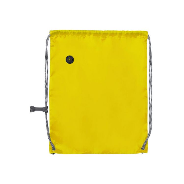 Sac à dos à cordelettes en polyester souple 190T aux couleurs vives. Passe-fil pour écouteurs, cordelettes de serrage grises extra épaisses avec accessoires de réglage et coins renforcés avec oeillets métalliques. (couleur jaune)