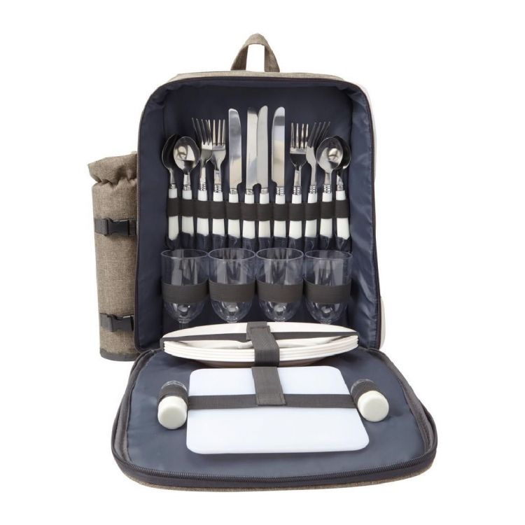 Sac à dos pique-nique en polyester 600D pour 4 personnes avec compartiment isotherme comprenant assiettes, couverts, verres, poivrier et salière.