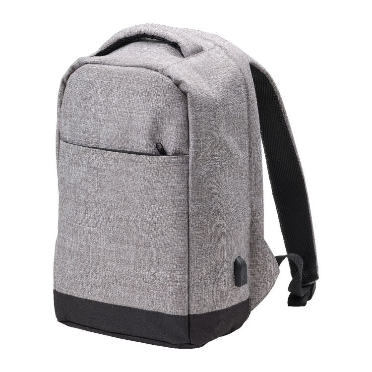 Sac à dos porte-ordinateur antivol de 15''en polyester 600D comprenant de multiples poches intérieures, une poche extérieure zippée au dos et un port USB latéral avec câble.