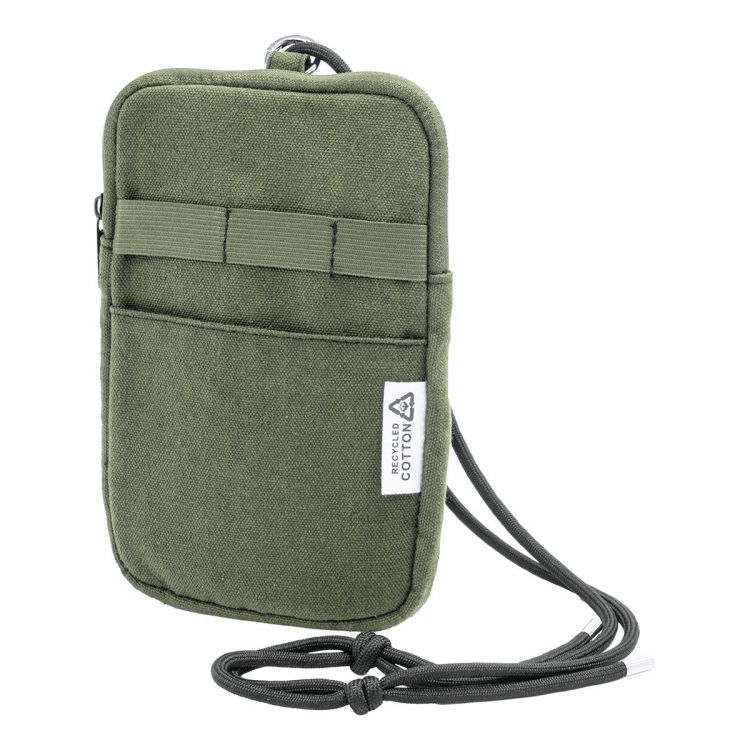 Sac épaule pour téléphone portable en canvas recyclé avec compartiment principal zippé, poche frontale et cordon réglable en polyester RPET. 70% coton recyclé et 30% polyester RPET. Avec étiquette distinctive en coton recyclé.