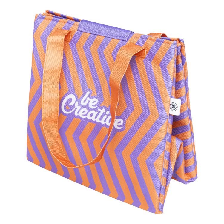 Sac isotherme sur mesure en polyester 600D RPET avec rembourrage en aluminium, fermeture velcro et longues poignées. Il sert également de panier et peut être déplié pour être utilisé comme couverture de pique-nique. Avec impression sur base de quadri en sublimation sur toute la surface et une étiquette RPET distinctive. Quantité minimale : 25 pièces