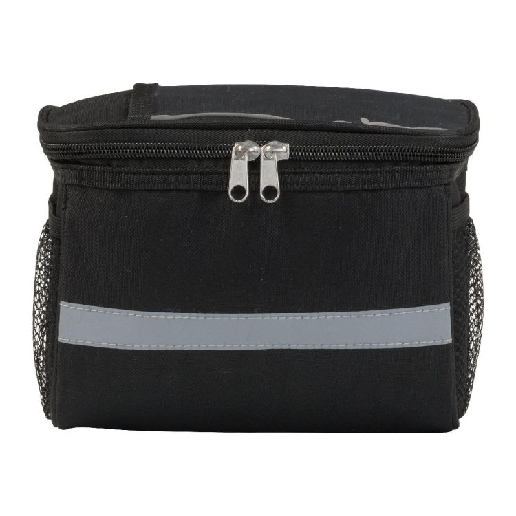 Sac isotherme en polyester 600D adaptable sur le guidon d'un vélo avec poches latérales filets et poche supérieure translucide.
