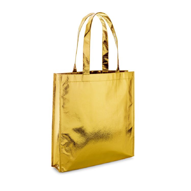 Sac non tissé laminé (90 g/m²) avec anses de 50cm et avec lamination brillante. Produit en couleur or