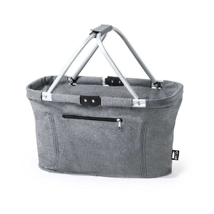 Panier pliable en RPET 600D résistant. Avec structure en aluminium résistante et 2 poignées de transport pliables en aluminium, avec sangle velcro assortie. Poche extérieure avec fermeture à glissière et étiquette extérieure avec logo RPET.Le matériau RPET est fabriqué à partir de plastique recyclé, afin de favoriser la réutilisation des déchets plastiques et d'aider à la durabilité de la planète. (couleur gris)