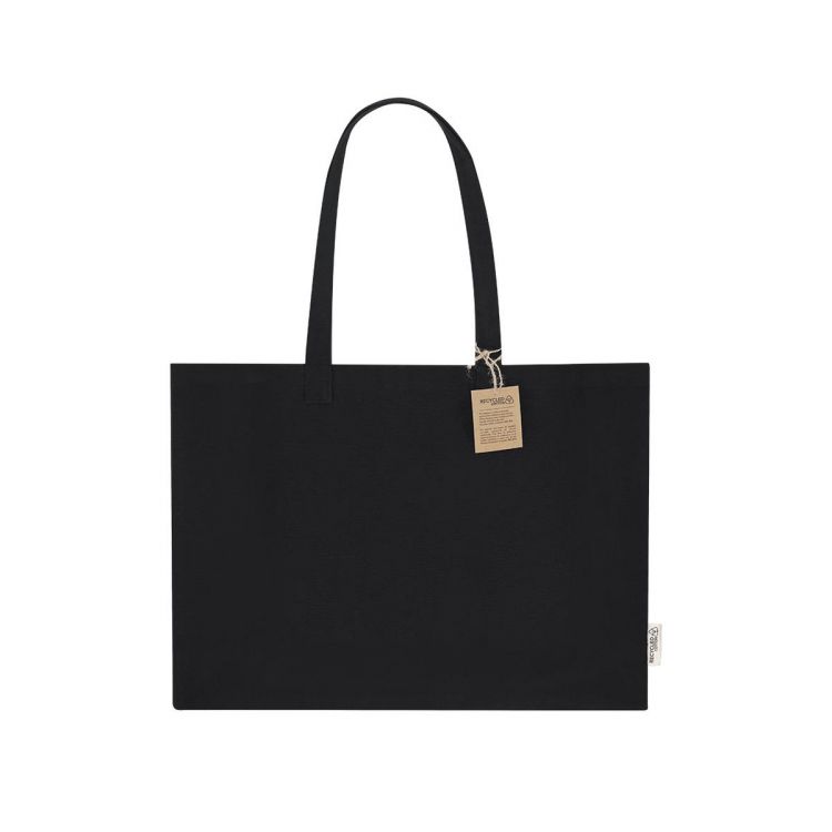 Sac fabriqué principalement en coton recyclé résistant de 300g/m2. De finition cousue avec soufflet et poignées longues de 70cm renforcées. Logo sur l'étiquette latérale et résistance jusqu'à 10kg de poids. (couleur noir)