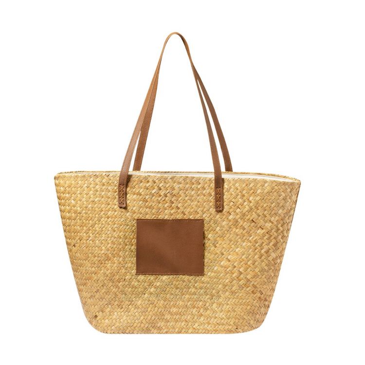 Sac de paille de forme rectangulaire au design décontracté. Grande capacité et avec de longues poignées originales en éco-cuir. Avec large patch extérieur en éco-cuir, spécialement conçu pour la personnalisation au laser et assorti aux poignées. (couleur naturel)