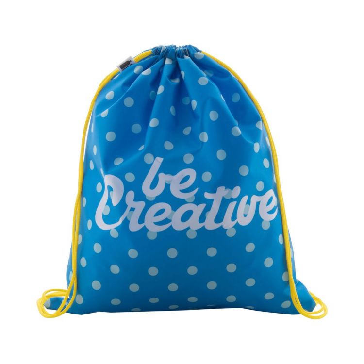 Sac piscine personnalisable en quadri avec cordelettes de couleur, 190T RPET. Impression en sublimation et labélisé RPET. Quantité minimale : 25 pièces.