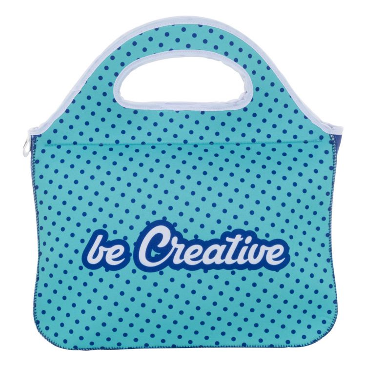 Sac à lunch en néoprène RPET avec compartiment zippé et poignées. Imprimé en sublimation sur toute la surface et labélisé RPET. Quantité minimale : 25 pièces
