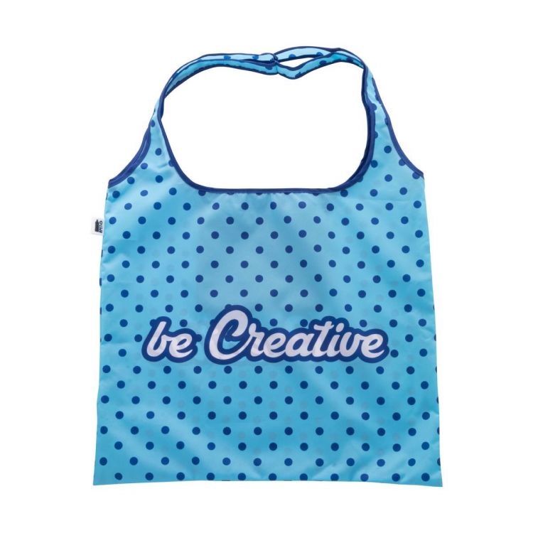 Sac shopping pliable sur mesure en polyester RPET 190T. Impression en sublimation sur toute la surface et labélisé RPET. Quantité minimale : 25 pièces