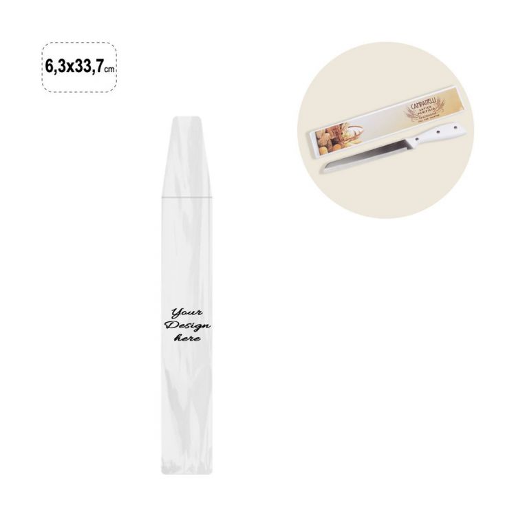 Enveloppe longue en PVC transparent avec ouverture sur le petit côté pour l'insertion d'encarts en papier, refermable avec un rabat.