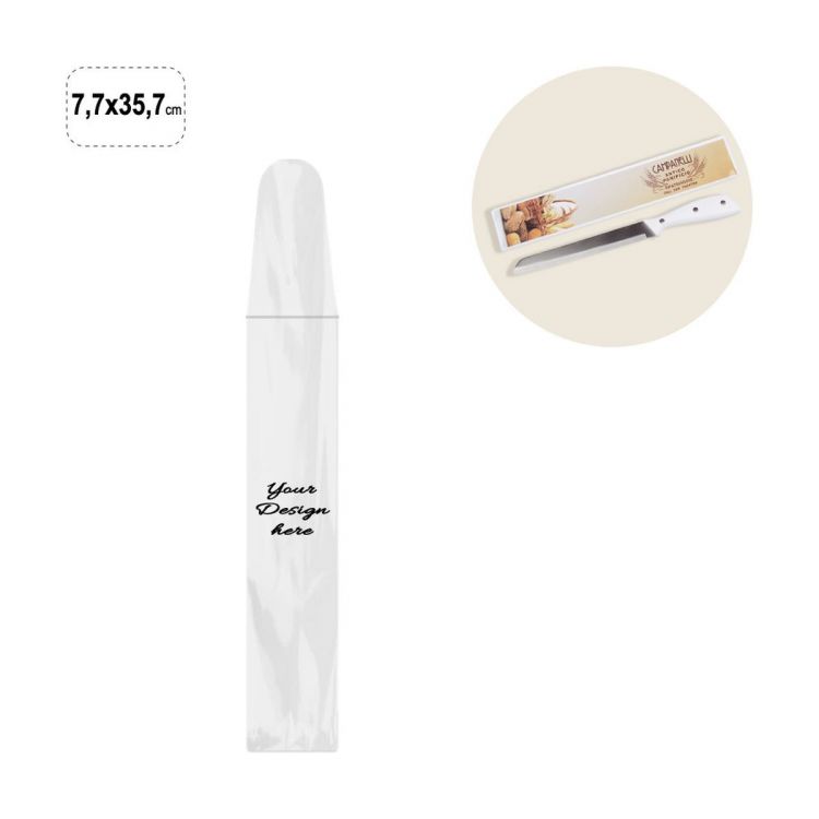 Enveloppe longue en PVC transparent avec ouverture sur le petit côté pour l'insertion d'encarts en papier, refermable avec un rabat.