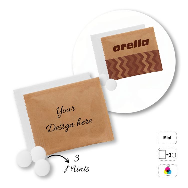 Sachet rectangulaire contenant des bonbons à la menthe à mâcher. Les lettres du code produit correspondent au nombre de menthes à l'intérieur : A- 1 menthe, B- 2 menthes, C- 3 menthes. Sachet alimentaire entièrement personnalisable au choix : sachet blanc ou transparent 100 % compostable ou papier blanc ou kraft (choix de la finition lors de la commande). Durée de conservation minimale : 12 mois.