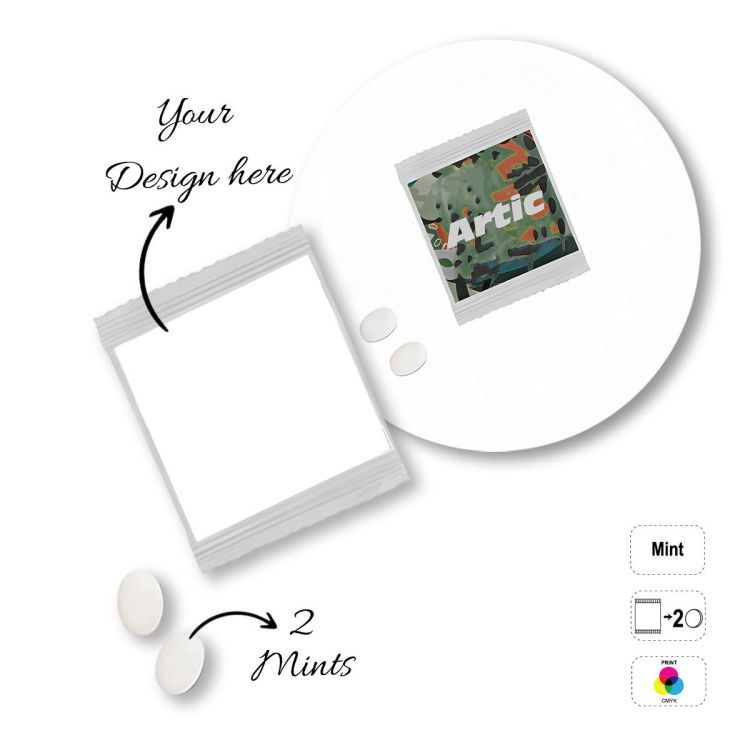 Sachet rectangulaire contenant des bonbons à la menthe sans sucre. Les lettres du code produit correspondent au nombre de menthes à l'intérieur : A- 1 menthe, B- 2 menthes, C- 3 menthes. Sachet alimentaire entièrement personnalisable au choix : sachet blanc ou transparent 100 % compostable ou papier blanc (choix de la finition lors de la commande). Durée de conservation minimale : 12 mois.