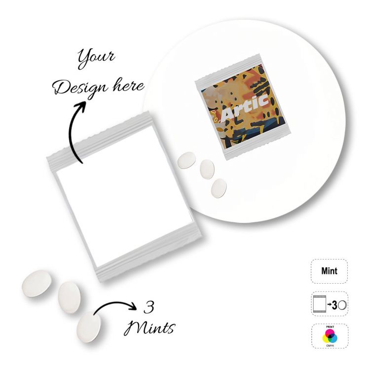Sachet rectangulaire contenant des bonbons à la menthe sans sucre. Les lettres du code produit correspondent au nombre de menthes à l'intérieur : A- 1 menthe, B- 2 menthes, C- 3 menthes. Sachet alimentaire entièrement personnalisable au choix : sachet blanc ou transparent 100 % compostable ou papier blanc (choix de la finition lors de la commande). Durée de conservation minimale : 12 mois.
