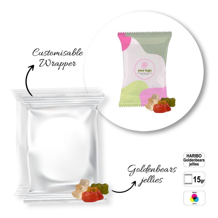 Boîte de bonbons. Les lettres du code produit correspondent à la forme du bonbon : A- Oursons dorés Haribo (15 g), B- Bonbons gélifiés en forme de framboise (parfums assortis : raisin et sambuca) (15 g), C- Mini bonbons colorés en chocolat avec des cacahuètes à l'intérieur (15 g). Emballage : sachet alimentaire entièrement personnalisable avec choix entre : sachet blanc ou transparent 100% recyclable ou sachet papier kraft 100% recyclable, avec ajout de film alimentaire à l'intérieur du sachet [teneur en plastique dans l'emballage < 65%], ( (choix de la finition lors de la commande). Durée de conservation minimale - 6 mois.