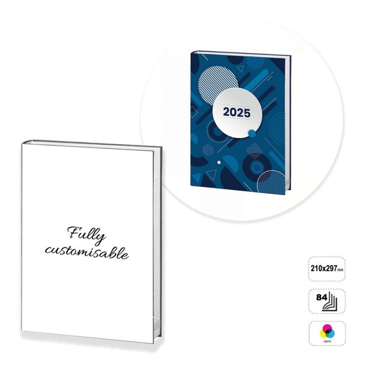 Agenda semainier entièrement personnalisable. Le produit est composé de 84 pages (couverture comprise) en papier de 90 grammes, imprimable en 1 couleur (noir), et d'une couverture en carton de 300 grammes avec finition brillante, imprimable au recto ou au recto et au verso en quadrichromie. Le pelliculage du recto est disponible en brillant, mat ou soft touch. Le produit est réalisé avec un procédé spécial afin de permettre à la colle qui les maintient de pénétrer davantage et de rendre le produit plus résistant. L'agenda peut être personnalisé en modifiant le modèle prédéfini, ou construit entièrement en suivant les directives fournies dans un modèle neutre.