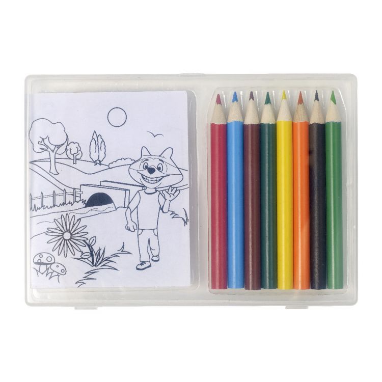 Set à dessin de 8 crayons de couleur et 20 feuilles de coloriage dans une boîte en plastique transparent.