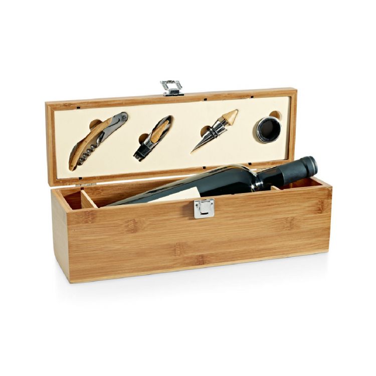 Set à vin en bambou, ABS et acier inoxydable. Cet ensemble comprend un tire-bouchon avec couteau de sommelier, un collier anti-gouttes, un verseur anti-gouttes avec bouchon et un bouchon. Le produit étant fabriqué à partir de matériaux naturels, la couleur du produit ainsi que le résultat de l'impression peuvent varier d'un produit à l'autre. Produit en couleur naturel